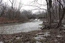 From the industrial zone, the river continues its course to the north, collecting the water from the Isabelle and Lasaline streams, passes under the autoroute 30 very close (east side) of the road of iron. Then the river enters from the south into the town of Delson where it winds north. The river continues its course passing in Candiac until its mouth.