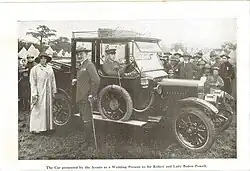 In 1929, during the 3rd World Scout Jamboree, he received as a present a new 20-horsepower Rolls-Royce car (chassis number GVO-40, registration OU 2938) and an Eccles Caravan.[59] This combination well served the Baden-Powells in their further travels around Europe. The caravan was nicknamed Eccles and is now on display at Gilwell Park. The car, nicknamed Jam Roll, was sold after his death by Olave Baden-Powell in 1945. Jam Roll and Eccles were reunited at Gilwell for the 21st World Scout Jamboree in 2007 and it has been purchased by a charity, B–P Jam Roll Ltd. Funds are being raised to repay the loan that was used to purchase the car.[59][60] Baden-Powell also had impacts on youth education.[61] By 1922, there were more than a million Scouts in 32 countries; by 1939, the number of Scouts was over 3.3 million.[62]