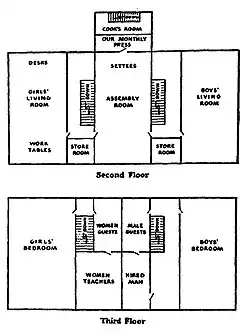 The students also did chores for two hours each day: the boys worked on the farm, in the garden or chopped firewood, while the girls did household duties, assisted with sewing, cooking and washing, and took care of the dining room. The students were provided with three meals a day, and were given plenty of time to sleep and play. Religious study was required, including church on Sunday and praying each morning and evening daily. Every night at dinner, along with singing and praying, every student had to recite a verse, or part of a verse, of Scripture from the Bible.[2]