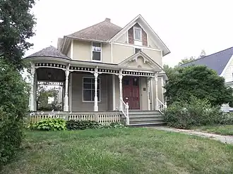 Robert Jones was a postal clerk in Waukesha. The architects Wolf and Waegli designed this house for him and it was built in 1897. It is two stories, with Queen Anne styling in the asymmetric facade, the hip-and-gable roof, the shingle-work in the gable ends, and the wraparound porch. The porch is especially striking, with its sunburst gable and the corner pavilion.[3]