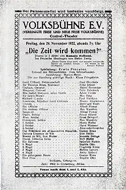 Rolland's dramas have been staged by some of the most influential theatre directors of the twentieth century, including Max Reinhardt and Erwin Piscator.[17] Piscator directed the world première of Rolland's pacifist drama The Time Will Come (Le Temps viendra, written in 1903) at Berlin's Central-Theater, which opened on 17 November 1922 with music by K Pringsheim and scenic design by O Schmalhausen and M Meier.[18] The play addresses the connections between imperialism and capitalism, the treatment of enemy civilians, and the use of concentration camps, all of which are dramatised via an episode in the Boer War.[19] Piscator described his treatment of the play as "thoroughly naturalistic", whereby he sought "to achieve the greatest possible realism in acting and decor".[20] Despite the play's overly-rhetorical style, the production was reviewed positively.[19]