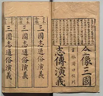 Romance of the Three Kingdoms is traditionally attributed to Luo Guanzhong,[10] a playwright who lived sometime between 1315 and 1400 (late Yuan to early Ming period) known for compiling historical plays in styles which were prevalent during the Yuan period.[11] It was first printed in 1522[11] as Sanguozhi Tongsu Yanyi (三國志通俗演義, Popular Romance of the Records of the Three Kingdoms) in an edition which bore a preface dated 1494.[12] The text may well have circulated before either date in handwritten manuscripts.[12]