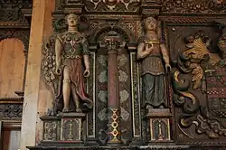 The polychrome engraved mantle of the Rotherwas Room bears a complex arrangement of figural representation and plant motifs, including: guilloche, cartouche motifs, decorative scrolls and foliage, gadroon nulling, and lozenges.[8] The central shield of the overmantel bears 25 family seals, including that of the de la Barre family. The shield sprouts flowing acanthus leaves, which are framed by the four Roman virtues: Justice (who originally held scales), Temperance (who held water and wine), Prudence (who held a mirror, book, or dove in addition to the snake), and Fortitude (who still holds a column).[34] Earlier examples of similar work can be seen in the mantel over the fireplace of Great Fulford, Devonshire.[35] The Bodenham coat of arms would have originally featured a background of deep azure. In heraldic terms, the crest consists of a horizontal stripe (called a fess) between three chess rooks, all rendered in gold. The identities of the remaining twenty-three family crests are not all certain, and some may even have been fabricated in order to visually amplify Bodenham's status.