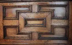 The paneling of the Rotherwas Room is made of walnut, a highly valued imported wood most likely imported from Germany or the Netherlands.[36] While oak was widely used in construction in the Rotherwas estate due to its abundance on the five thousand acre property, large walnut trees did not exist in England prior to 1650 and were rarely used in English paneling if at all.[8] The wainscoting design of lower inner-framed tiers and upper-arcaded panels divided by pilasters and capitals is extremely similar to that of Billesley Manor, Warwickshire and Carbrook Hall, near Sheffield.[37] According to Charles Bodenham, the two doors cut out of the paneling were added in 1611 and 1732 respectively.[38]