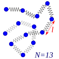 where k is the spring constant, the one-bead friction coefficient and random force a zero-mean Gaussian noise that fulfills the fluctuation–dissipation theorem.[2] At either chain end the missing neighbor term is omitted.