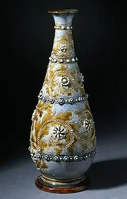 There were initial technical difficulties in producing the "art" pieces; at first they were fired in the open kiln with other wares, but later saggars were used. They were not especially profitable, sometimes not profitable at all, but there were huge profits in other parts of the business. Like other manufacturers, Doulton took great trouble with the wares submitted to international exhibitions, where it was often a medal winner.[12] The period 1870–1900 saw "the great years of Doulton's art stoneware", which remains popular with collectors.[13]