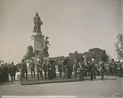 The Canadian portion of the 1901 royal tour began 16 September 1901, when the RMS Ophir arrived in Quebec City.[76] The royal party – which consisted of 22 people, landed at Quebec City on 16 September. During his time in Quebec City, Prince George invested Lieutenant Richard Turner with the Victoria Cross for his conduct during the Battle of Leliefontein in a ceremony at the Plains of Abraham, and spoke to students at the Université Laval.[80] Moving west of Quebec City by railway, the group made stops to Montreal, and Ottawa.[81] Throughout the royal tour, Prince George placed an emphasis on praising the creation and expansion of the country during his own lifetime, giving a speech about the country's development and growth in Ottawa and Winnipeg.[82]