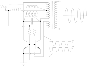 Secondly, a resonant tank circuit is formed by adding a capacitor in parallel with the transformer, either on the primary side across the switching transistors, or on the secondary side across the output winding, or a combination of both. This change means that the Baxandall output voltage is a sine-wave (refer Sine wave), whereas the classic Royer circuit output voltage is a square wave (refer square wave).