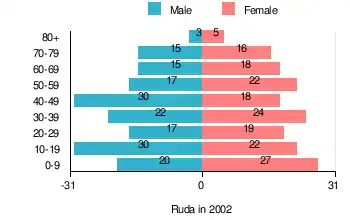 According to the 2002 Poland census, there were 340 people residing in Ruda village, of whom 49.7% were male and 50.3% were female. In the village, the population was spread out, with 27.1% under the age of 18, 31.8% from 18 to 44, 21.8% from 45 to 64, and 19.4% who were 65 years of age or older.[1]