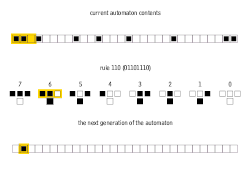An animation of the way the rules of a 1D cellular automaton determine the next generation, using Rule 110.