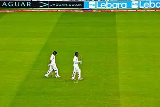 Zaheer Khan walking about to bat with Abhinav Mukund as his runner during the First Test against England in July 2011, shortly before runners were outlawed in international cricket.