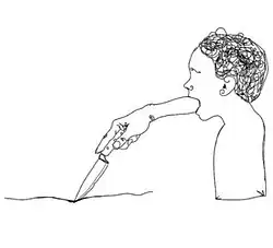 Sparse line drawings accompany her poems.[14][88] They have been compared to outsider art; her drawings and poetry have seen allusions to childhood artistry.[89][90][91] The National Poetry Library noted that the art in Milk and Honey, functions like a graphic novel.[92] The style of drawing continues in The Sun and Her Flowers.[93] Her illustrations, juxtaposed with the poems, are "striking" and "often disturbing", with one, for example, linking self-harm with despair.[88][94] Images that appear in her work include twisting bodies, crawling flowers, and fingers forming the shapes of hearts. Kaur explained that her style is intended to be recognisable and evoke a brand, akin to Apple's.[88] She creates them following their respective poem being written.[50] Since its inception, Kaur's public image has been denoted as authentic and individual, spiritual and boldly feminist.[95]