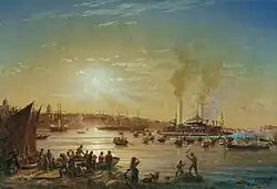 A temporary slipway was built at the New Admiralty Shipyard in January 1871[10] and construction of Novgorod, named after the city,[11] began on 13 April. Using two shifts to speed construction, her hull was completed by 29 December, when the official keel-laying ceremony was held. Within two weeks it was disassembled, and the first shipment of parts arrived at Nikolaev on 2 April 1872. Reassembly began on a specially-prepared slipway eight days later. As there was no rail line between Saint Petersburg and Nikolaev, the components had to be railed to Odessa, where they were transshipped onto river barges and steamers. The boilers were too large and had to be shipped by freighter from the Baltic Sea to Odessa for transshipment. Construction was delayed by late deliveries of parts and the workforce's lack of experience; the ship was finally launched on 2 June 1873, with Grand Duke Konstantin Nikolayevich in attendance. Novgorod's guns were mounted in September, and she entered service the following year, at a cost of 2,830,000 rubles.[12]