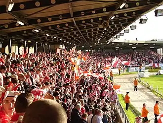 In January 2016, the club announced the new stadium would be built ready for the 2017 season, and that work would start in July.[26] On 5 July 2016, Derry City and Strabane District Council advised they were in the final stages of a procurement process for the Brandywell stadium. Two months later, the final stages were still in progress. As the 2016 season came to a close, club chairman Philip O'Doherty said that European football at Brandywell was under threat due to an as-yet-unknown start date for the redevelopment. On 19 October, Derry City and Strabane District Council stated the appointment of a contractor was ongoing. Derry City qualified for the Europa League for the 2017/18 season. Work finally commenced in December 2016 on the new 3G pitch and all-seated stand, which was completed in time for the start of the 2018 season.[27] All home games in 2017 were played at Maginn Park.