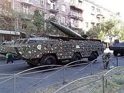 OTR-21 Tochka (Russian: оперативно-тактический ракетный комплекс (ОТР) «Точка», romanized: operativno-takticheskiy raketnyy kompleks (OTR) "Tochka", lit. 'Tactical Operational Missile Complex "Point"') is a Soviet tactical ballistic missile. Its GRAU designation is 9K79. Its NATO reporting name is the SS-21 Scarab. One missile is transported per 9P129 vehicle and raised prior to launch. It uses an inertial guidance system.[3][4]