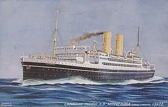 On 5 December 1918, Minnedosa began her maiden voyage from Liverpool to St John, New Brunswick, repatriating troops of the Canadian Expeditionary Force.[1] After trooping duties, Minnedosa began civilian service between Liverpool and Canada. From 1922 to 1927 her route was between Antwerp and St John[1] via Southampton.[8] In 1925 R&W Hawthorn, Leslie & Co refitted her in Hebburn,[1] which increased her tonnages to 15,186 GRT and 8,912 NRT.[9] For a period in the 1920s Minnedosa's Master was Captain Ronald Stuart, VC, which entitled her to fly the Blue Ensign.[10]