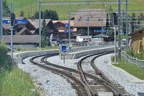 Saanenmöser railway station (German: Bahnhof Saanenmöser) is a railway station in the municipality of Saanen at the Saanenmöser Pass in the Swiss canton of Bern. It is an intermediate stop on the 1,000 mm (3 ft 3+38 in) metre gauge Montreux–Lenk im Simmental line of Montreux Oberland Bernois Railway.[1] At 1,271 m (4,170 ft), it is the highest station on the line. An aerial cablecar at the station leads to Saanenwald-Saanerslochgrat.[5]