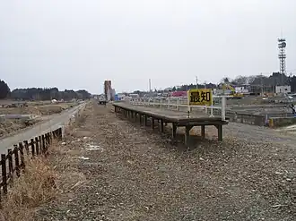• "JR気仙沼線 【前面展望 2】 南気仙沼⇒陸前階上" (video). YouTube.com. Archived from the original on 2021-12-13. Retrieved 2011-04-26. video of a train trip from Minami-Kesennuma Station to Rikuzen-Hashikami Station in 2009, passing through Matsuiwa Station and Saichi Station without stopping at around 03:05 minutes and 05:05 minutes, respectively. Satellite photos (e.g., in Google Maps) showed that large sections of track and railway bridges were severely affected or washed away by the 2011 tsunami. Minami-Kesennuma Station, Matsuiwa Station and Saichi Station were all badly damaged or destroyed.