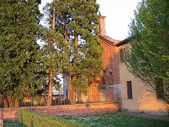 After the suppression of the monastic orders by Napoleon Bonaparte, the farmhouse and church were sold to various landowners.[15] In 1886 the church was restored and some frescoes of the fourteenth century were found. They depict Saint Ambrose among his brothers Satyr and Marcellina with the holy martyrs Sebastian and Pope Fabian.[16]
