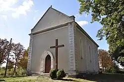 The church is one-nave, brick, plastered, in its modest architecture there are neo-Gothic features (pointed ends of the entrance portal, windows). Each of the surfaces of the side facades is divided by two pilasters.[4]