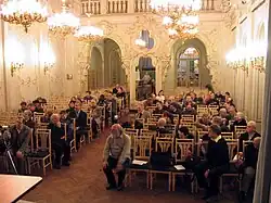 The Society was dissolved and subsequently revived twice, each time changing its name, sometime in between 1905 and 1917, the society ceased to function and by 1917 it had completely dissolved, perhaps due to the social agitations that destroyed many existing Russian scientific institutions.[2] It was re-established by the initiative of Alexander Vasilyev in 1921 as the Petrograd Physical and Mathematical Society (subsequently called the Leningrad Physical and Mathematical Society). In 1930, the self-dissolution of the society was due to political reasons.[4] Before the beginning of World War II in 1941, Leonid Kantorovich proposed to revive the society, and a similar failed attempt was made by Vladimir Smirnov in 1953: only in 1959 Yuri Linnik did succeed in reestablishing the society (then called the Leningrad Mathematical Society).[5] It regained the original name the St. Petersburg Mathematical Society in 1991.