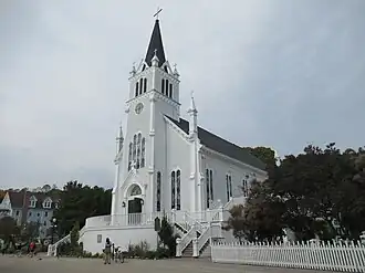 The Jesuit missionary Claude Dablon inaugurated the original church on Mackinac Island in 1670, and the earliest surviving parish records date back to 1695.[2] After moving from Fort de Buade to Fort Michilimackinac in 1708 and from Fort Michilimackinac to Mackinac Island in 1781, the parish used a historic log church for decades. It constructed the current church complex in 1874 on a site donated by the former fur trader Magdelaine Laframboise.[3] The church was dedicated as a Michigan State Historic Site on December 20, 1990.