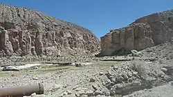 After joining with the two aforementioned streams, the Salado River enters a floodplain, which is used for pasturage by the inhabitants of the nearby localities, including Toconce, Caspana and Aiquina. Then, the Salado again flows through a narrow canyon, where the so-called Devil's Bridge is found, which is a 5-metre wide gash that the river has cut through rhyolite terrain.