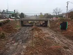 First phase of construction was focused on and around Peters Creek Parkway (NC 150), which included lowering the freeway to establish a minimum vertical clearance of 17 feet (5.2 m) at the new Fourth Street two-lane bridge and 17.5 feet (5.3 m) at the new seven-lane Peters Creek Parkway bridge. After two years of intermittent closures, the new Peters Creek Parkway bridge was opened on November 12, 2018.[32][33] On November 17, the second phase began with the complete shutdown of Business 40 between Peters Creek Parkway and John Gold Memorial Expressway (US 52/US 311/NC 8); three alternate routes were set up through the downtown area for locals while travelers are encouraged to remain on mainline I-40.[34]