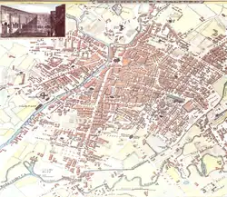 Salford began to emerge as a small town early in the 13th century. In 1228, Henry III granted the caput of Salford the right to hold a market and an annual fair. The fairs were important to the town; a 17th-century order forced each burgess – a freeman of the borough – to attend, but the fairs were abolished during the 19th century.[25] The Earls of Chester aided the development of the caput, and in 1230 Ranulf de Blondeville, 6th Earl of Chester made Salford a burgage, or free borough.[22][26] The charter gave its burgesses certain commercial rights, privileges and advantages over traders living outside Salford; one of the 26 clauses of the charter stated that no one could work in the Hundred of Salford unless they also lived in the borough.[4][14][25] Salford's status as a burgage encouraged an influx of distinguished families, and by the Late Middle Ages Salford was "rich in its manor houses", with over 30 within a 5-mile (8 km) radius of Ordsall.[4] These included Ordsall Hall (owned by the Radclyffe family) and Broughton Hall, owned by the Earls of Derby.[4][20]