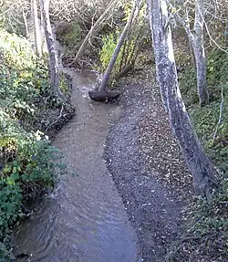 Salmon Creek originates about 2 miles (3 km) west of the town of Occidental near the junction of Joy Road and Bittner Road.[1] It parallels Bittner Road eastward, passing just south of Occidental, where it turns right and follows Bohemian Highway to the town of Freestone. From there, it curves south and then west, passing Watson School historic park as it parallels Bodega Highway to a confluence with Nolan Creek just east of the town of Bodega. It flows through Bodega, then follows Salmon Creek Road westward into a narrow canyon, where it is joined by Tannery Creek, Fay Creek, Coleman Valley Creek, and Finley Creek. Salmon Creek emerges from the canyon between Irish Hill and Coleman Hill and crosses State Route 1 at milepost 12.49, entering Sonoma Coast State Beach south of the ranger station. It parallels Bean Avenue to Salmon Creek Beach, which it bisects as it enters the Pacific Ocean.