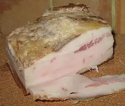 Salo or slanina[a][b] is a European food consisting of salt-cured slabs of pork subcutaneous fat[1] with or without skin and with or without layers of meat. It is commonly eaten and known under different names across Central, Eastern and Southeastern Europe. It is usually dry salt or brine cured. The East Slavic, Hungarian and Romanian variety may also be cured with paprika or other seasonings added, whereas the South and West Slavic version is often smoked.