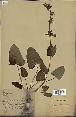 Salvia roborowskii is an annual or sometimes biennial herb that is native to a wide area that includes Tibet, Sikkim, and five provinces in China, growing on wet stream banks, grasslands, and hillsides between 8,000 and 12,000 feet elevation.