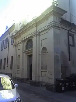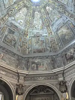 This church or oratory was erected by the Confraternity of San Michele, also called dei Nobili (aristocracy), which was granted in the 16th century this land next to the Cathedral cemetery. The nave is octagonal in shape and has a cupola frescoed starting in 1597 by Giovanni Antonio Cassano. The frescoes depict the Stories of the Archangels Michael, Raphael, and Gabriel. The frescoes are ringed with grotesque decorations. In 1601, the interior had stucco decoration. The church also has a series of canvases depicting the Annunciation, the Announcement to the Shepherds, a Nativity, St Michael Archangel, the Madonna of the Assumption with St Francis and a Certosini, and Repose in Egypt are attributed (before 1614) to Giovanni Romano and Guglielmo Caccia (Il Moncalvo). The Dream of St Joseph (1627) was painted by Guglielmo Crosio.[1]