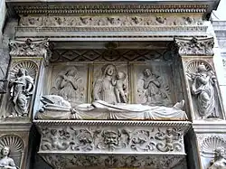 The wall tomb of Cardinal Bernardino Lonati is similar to the coeval sepulchre of Ludovico Podocataro, and they both belong to the group of monuments from the age of Pope Alexander VI. The monument was financed by Cardinal Ascanio Sforza after the death of his protégée on 7 August 1497, not long after Lonati had led an unsuccessful expedition against the Orsini family by order of the Pope. The architectural composition of the monument follows the models set by Andrea Bregno.