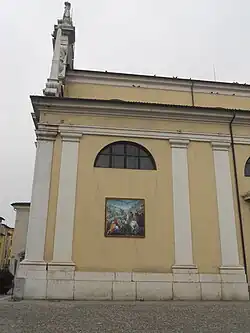 On the counterfacade wall of the right aisle hangs the Apparition of Saints Faustinus and Jovita during the siege of Brescia by Nicolò Piccinino, a canvas by Grazio Cossali dated 1603 that takes up the theme of the miracle that took place in 1438 on the Roverotto terraces, the same one reproposed by Giandomenico Tiepolo a century and a half later in the left fresco of the presbytery. Cossali's scene, however, is usually the better known of the two since it was traditionally used to symbolize and recall the event.[109]