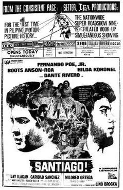 Santiago! is a 1970 Philippine war drama and action film directed by Lino Brocka and starring Fernando Poe Jr. and Dante Rivero.[1] Set during World War II, the film depicts a weary guerrilla, Gonzalo, who withdraws from the battlefield.[2] The film is the second directorial assignment of Brocka following his debut offering "Wanted: Perfect Mother". The film is also the first and only collaboration of Brocka and Poe, and features a rare scene featuring FPJ shedding a tear.[3][4] The film is likewise notable for being the vehicle for Hilda Koronel's acting debut which also brought her her first acting award.[5]