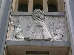 The curved windows of the church are stained glass designs by Galo Ocampo whose bases show different ecclesiastical seals.[4] The windows depict the original 15 Mysteries of the Holy Rosary as well as the Battles of Lepanto and La Naval de Manila; and the martyrdoms of San Vicente Liem de la Paz and San Francisco Capillas, Dominican protomartyrs of Vietnam and China, respectively.[12] Right behind Santo Domingo Church's facade is an intricately carved panels and stained glass windows lie a treasure trove of the Philippines' rich cultural heritage and the object of centuries-old devotion, the image of Our Lady of the Rosary, La Naval de Manila, the oldest Philippine-made ivory Marian icon in the country.[12]