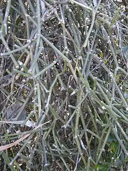 Sarcostemma is a formerly recognized genus of flowering plants in the dogbane family, Apocynaceae, first described as a genus in 1810. The name is derived from the Greek words σαρκὸς (sarkos), meaning "flesh," and στέμμα (stemma), meaning "garland".[1] Members of the genus were known generally as climbing milkweeds or caustic bushes. The genus Sarcostemma has been shown to be nested within the genus Cynanchum, and in 2012 Sarcostemma was put into synonymy with Cynanchum.[2][3]