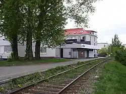 In 1943, a small station building designed by Anna Schröder was constructed, and in 1956, it was extended by building a warehouse. It was replaced with a new one in 1965, which also housed ticket sale services.[2] The latter building, having fallen out of use long ago and having accumulated moisture damage, was demolished in October 2021.[6]