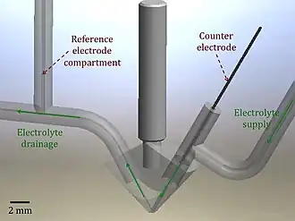SFC utilizes V-formed geometry with a small opening on the bottom (in range of 0.2-1mm diameter) used to establish the contact with sample. The convective flow is sustained also in non-contact mode of operation that allows easy exchange of the working electrode.[1]