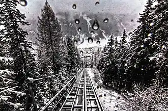 The Schatzalp-Bahn is a funicular railway in Davos, Switzerland. The line leads from Davos-Platz at 1,557 m (5,108 ft)[1] to Schatzalp at 1,861 m (6,106 ft).[1] It has a length of 712 m (2,336 ft)[1] at a maximum inclination of 47%[1] with a difference of elevation of 304 m (997 ft).[1] The funicular has two cars on a single track with a passing loop. It provides access to Schatzalp and Strela skiing area.[2]