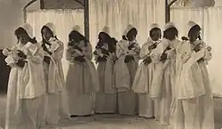 The schools first year of operation they enrolled approximately 88 students in 1901. The first two years of operation there was no main schoolhouse until, the brick main schoolhouse, was completed in 1903. Courses would begin in the new building in the fall and the enrollment of students would then be 150 students.[3] The female student population of the school worked towards skills that would be useful for jobs that involved beadwork as well as laundering. The male student population were educated in classes that would help them get jobs in industrial fields.[3] The students would spend half of their school day working around the schoolhouse with chores such as cooking, laundering, and washing as well as agricultural jobs as well. The students were separated by gender and educated in order to support the modern American view of the nuclear family by allowing the female students to perform housework and the male students learn trades.[4]