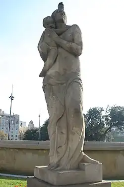 Motherhood Vicenç Navarro Stone 2,73 x 0,92 x 1 It is one of the figures located on the upper terrace, of those that originally were to be in the pavilion designed by Nebot for the square. When this project was cancelled, it was left as a free-standing sculpture, located on a pedestal and facing the mountain side of the square. It is an allegory of motherhood, represented by a woman with a naked torso and a tunic that covers her from the waist down, holding a child in her arms. This theme was fashionable at the time, generally related to conservatism, not in vain it was an official commission from institutions that emanated from the dictatorship of Primo de Rivera. Navarro made two other works for the square, Woman with Angel and The Night, although the latter was finally installed in the Parc de la Ciutadella.[19]