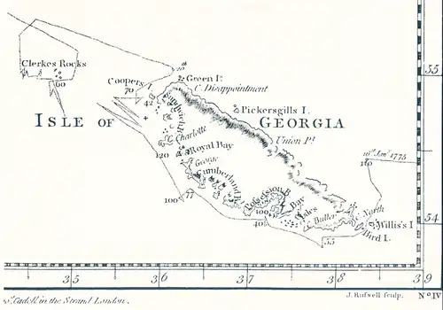 The sealing industry extended further south to the South Georgia island, first mapped by Captain James Cook in HMS Resolution on 17 January 1775. During the late 18th century and throughout the 19th century, South Georgia was inhabited by English and Yankee sealers, who used to live there for considerable periods of time and sometimes overwintered. In 1778, English sealers brought back from the Island of South Georgia and the Magellan Strait area as many as 40,000 seal skins and 2,800 tons of elephant seal oil. More fur seals from the island were taken in 1786 by the English sealing vessel Lord Hawkesbury, and by 1791, 102 vessels, manned by 3,000 sealers, were hunting seals south of the equator. The first commercial visit to the South Sandwich Islands was made in 1816 by another English ship, the Ann.