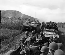 As the 1st Marines fought its way along the Inchon-Seoul highway and into Yongdungp'o, the 7th Infantry Division protected its right flank and engaged KPA units moving toward the battle area from the south. An extensive minefield delayed the 32nd Regiment on the 20th as it attacked toward Anyang-ni where it was to cut the Seoul-Suwon highway. Exploding mines damaged three tanks of A Company, 73rd Tank Battalion, and completely blocked the narrow dirt road the column was following. Colonel Beauchamp, the regimental commander, had a narrow escape. A mine destroyed his jeep, killing the driver and wounding the radio operator a few minutes after he had left it. Engineer troops removed more than 150 mines from this field. The regiment during the day captured T'ongdok Mountain and part of Copper Mine Hill.[3]: 521