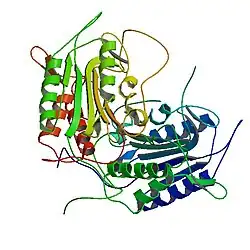 The protein Sf caspase-1 is the insect ortholog of the human effector caspases CASP3 (CPP32) and CASP7 (MCH3) in the species Spodoptera frugiperda (Fall armyworm).[1][2] It was identified as the target of the baculoviral caspase inhibitor protein P35, which it cleaves and by which it is inhibited.[1] Like other caspases, Sf caspase-1 is an aspartate-specific cysteine protease that is produced as an inactive proenzyme and becomes activated by autocatalytic cleavage.[1] The Sf caspase-1 proenzyme is cleaved after the amino acid residues Asp-28 and Asp-195, resulting in a smaller 12 kDa fragment and a larger 19 kDa fragment.[1][2] Just like with human caspases CASP3 or CASP7, the two cleavage fragments form heterodimers, which again form biologically active dimers-of-heterodimers consisting of two smaller and two larger fragments.[2] Some experiments also showed cleavage of Sf caspase-1 at the residue Asp-184, resulting in an 18 kDa instead of 19 kDa fragment, however this result is likely an in vitro artefact.[2] The insect immunophilin FKBP46 is a substrate of Sf caspase-1, which cleaves full length FKBP46 (~46 kDa) resulting in a ~25 kDa fragment.[1]