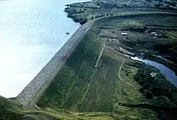 The dam is an embankment structure 145 feet (44 m) high and 12,843 feet (3,915 m) long, with an elevation of 2,318 feet (707 m) at the crest.[3] A catchment area of 3,120 square miles (8,100 km2) lies above the dam site.[4] At full pool, the reservoir has a capacity of 468,585 acre-feet (0.577991 km3), with a surface area of 12,150 acres (4,920 ha).[4] Normal conservation water levels are much lower, at 81,443 acre-feet (0.100458 km3).[2] Regular water discharges pass through an outlet works with a capacity of 600 cu ft/s (17 m3/s), while flood flows are released through two spillways: a morning glory inlet with a capacity of 5,700 cu ft/s (160 m3/s), and an emergency overflow channel that can pass up to 127,000 cu ft/s (3,600 m3/s).[2][5]
