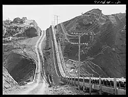 In November 1938, construction started on a diversion channel that would shunt water to the east (left) side of the river so the foundations could be laid on the west side. The left bank of the river was widened and deepened using explosives, and a cofferdam was built to dry up the bypassed section.[29] To supply sand and gravel to make concrete at the construction site, Pacific Constructors built the largest conveyor belt system in the world,[18] 9.5 miles (15.3 km) long, that reached from Redding to the dam site. This was capable of transporting 1,100 tons of material per hour, and over the entire construction process, hauled more than 12 million tons of rock.[30] The belt, which had some 16,000 rollers, was divided into 26 sections, 23 of which were powered by individual 200 horsepower (150 kW) motors. The remaining three were downhill and did not require power; in fact they were retrofitted to generate power for some of the other sections.[31]