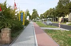 A sidewalk (North American English),[1][2][3] pavement (British English, South African English), or footpath (Irish English, Indian English, Australian English, New Zealand English) is a path along the side of a road. Usually constructed of concrete, pavers, brick, stone, or asphalt, it is designed for pedestrians. A sidewalk is normally higher than the roadway, and separated from it by a curb. There may also be a planted strip between the sidewalk and the roadway and between the roadway and the adjacent land.