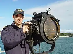 A Royal Australian Navy CIS Sailor sending a message using a 10" Signal Projector in 2005
